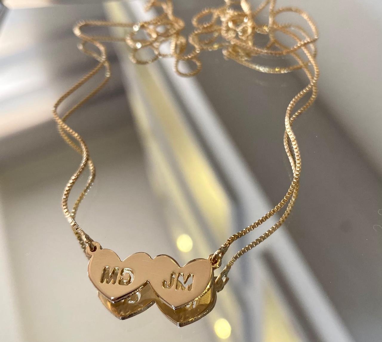 O colar personalizado com dois corações e iniciais é uma joia exclusiva, perfeita para eternizar laços e celebrar conexões especiais.